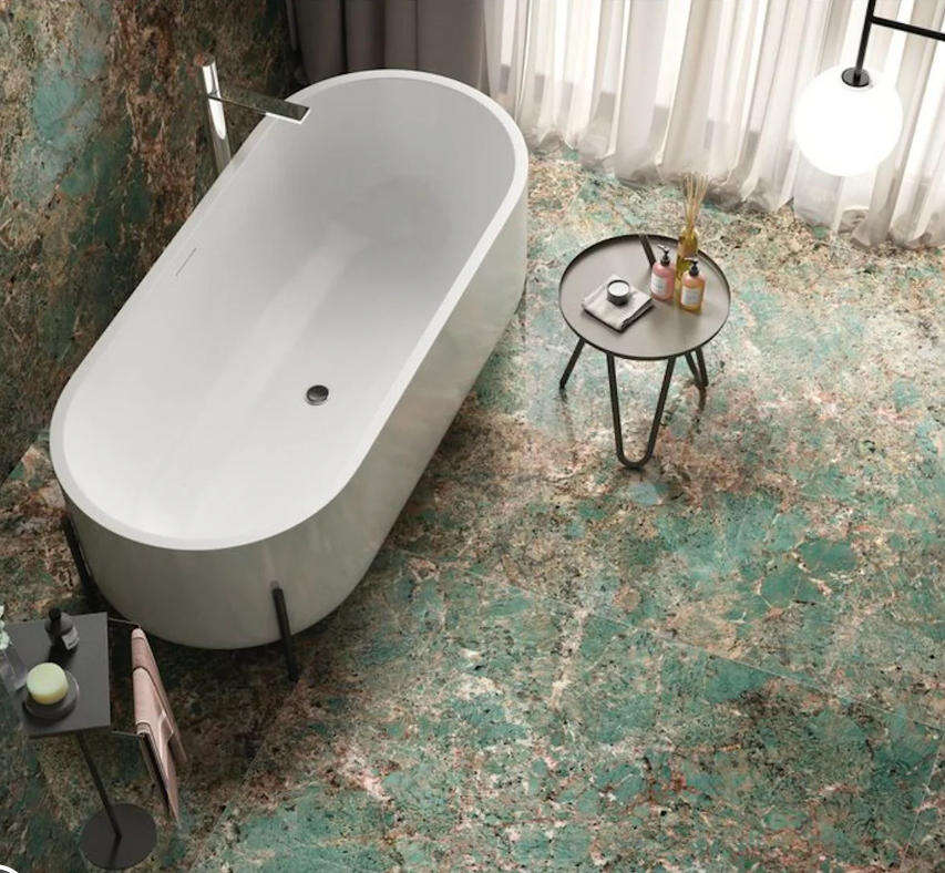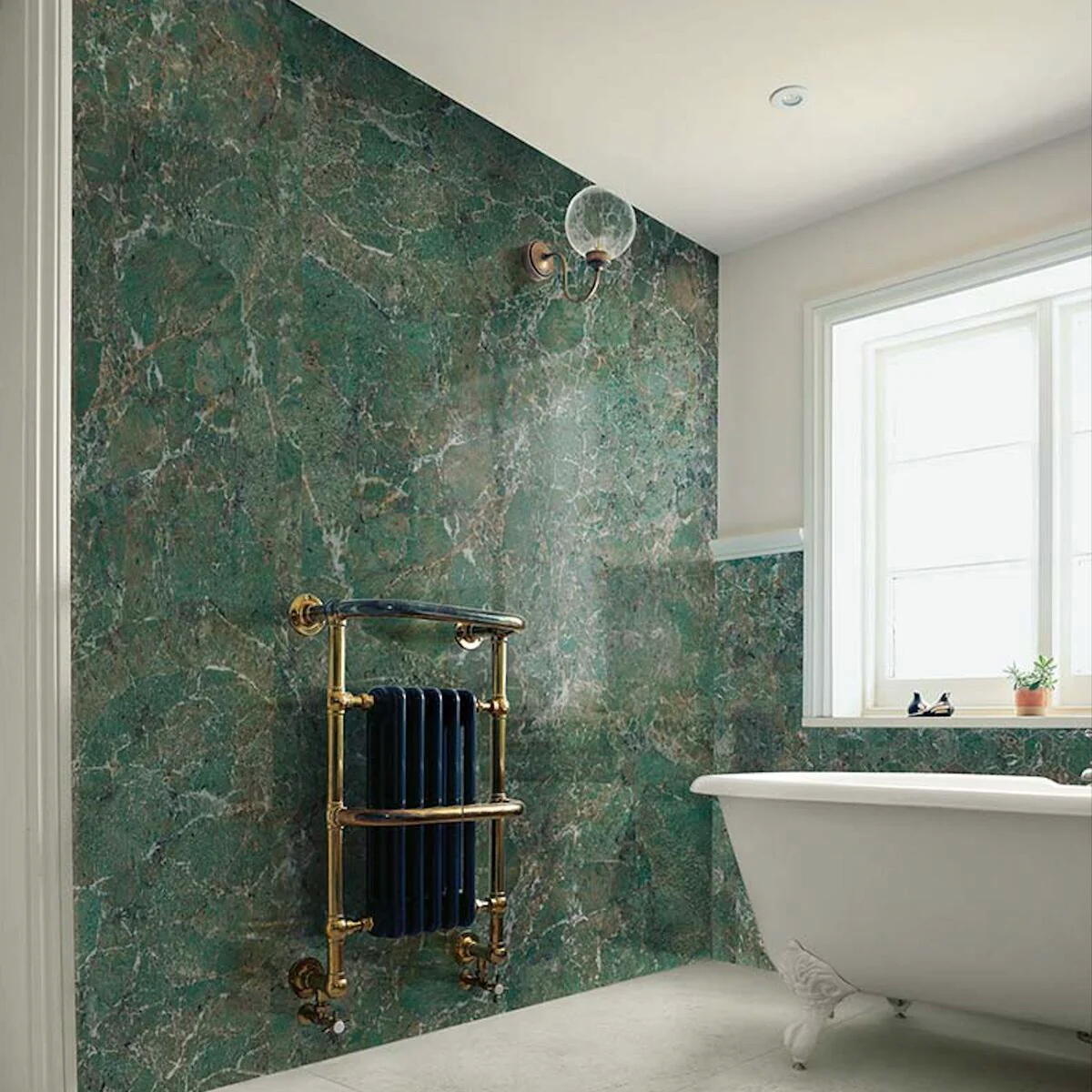 This luxuriousmarble withNatural Quartz is from Brazil,the base color features rich green tones,meantime,a few gold and brown veining,they are quite natural and perfect mixture together.Please take a quick look at this prettybathroompicture,obviously itfeatures a bold design dominated by striking Amazon green marble on the walls and vanity, creating a dramatic focal point.Usually the rich green tones contrast elegantly with the polished white marble flooring, which showcases distinctive gold and brown veining.