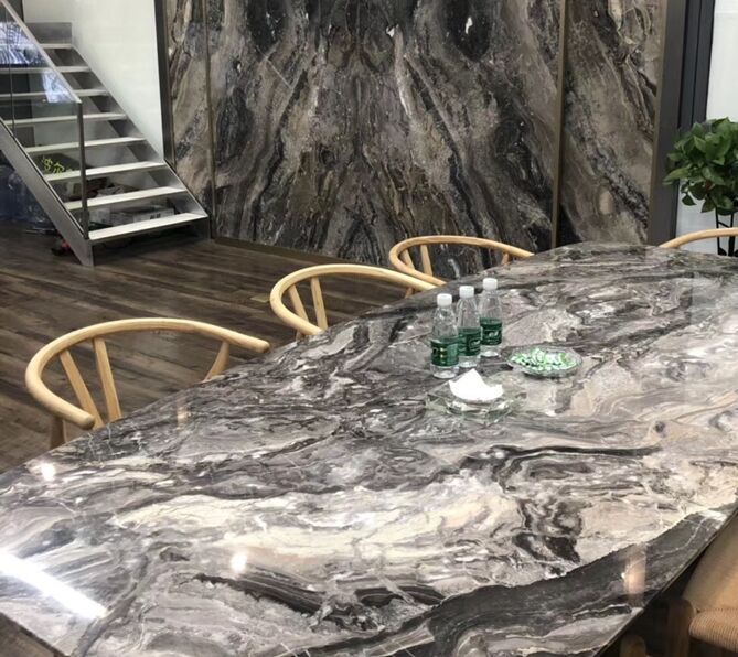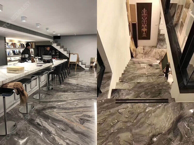 sweeping veining and rich blend of dark grey,brown and taupe hues. |