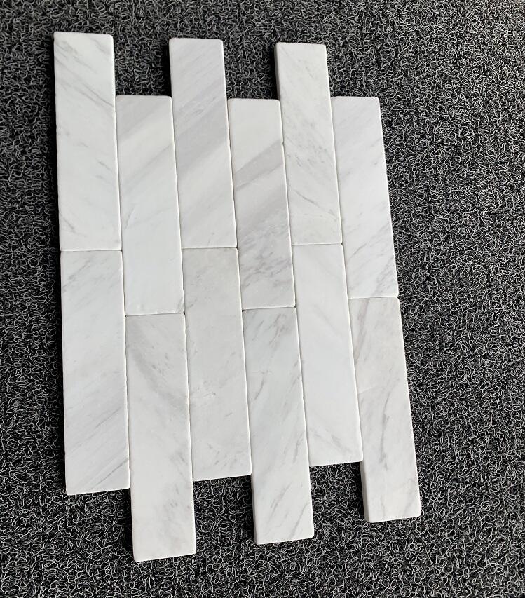 Crafted from premium Italian Calacatta marble, this tile features the stone's signature bright white base punctuated by distinct, dramatic grey and gold veining. The unique "finger stone" or picket shape of the mosaic creates a modern, linear texture, adding depth and contemporary elegance to any wall application.