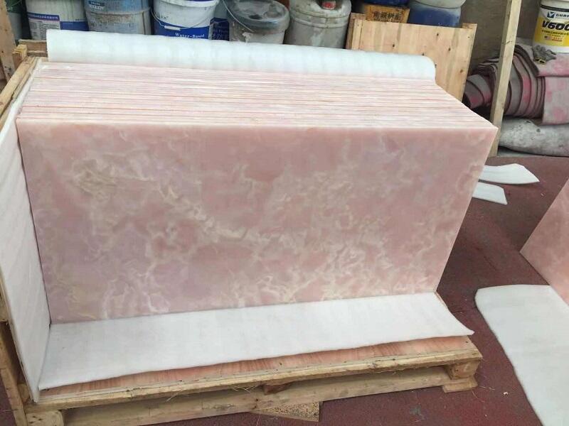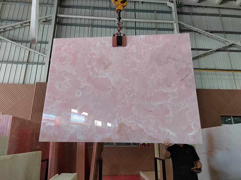 Pink Onyx is often used in backlit applications, where its translucent properties allow light to pass through, illuminating the stone and accentuating its natural beauty. Additionally, its stunning aesthetic makes it a popular choice for luxury bar and restaurant wall cladding, creating an ambiance of opulence and refinement.