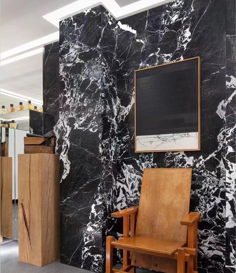 Renowned for its striking interplay of jet black and pure white veins, Grand Noir Antique marble slabs and tiles stand unparalleled in the natural stone world. Unlike any other variety, this marble showcases a captivating dance of contrasting hues - each maintaining its distinct character while creating harmonious visual tension across the surface.