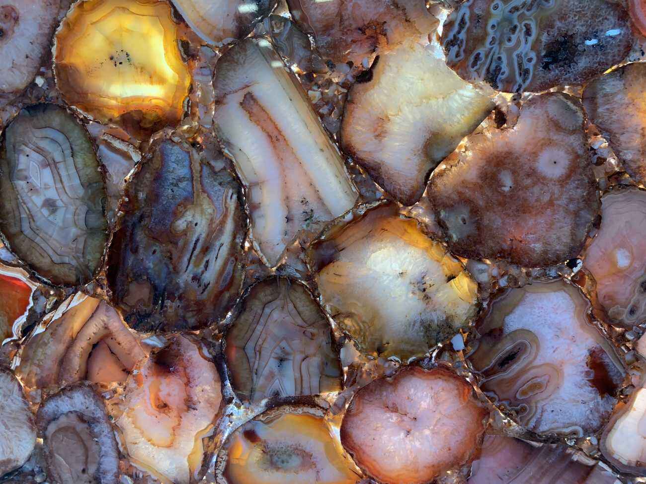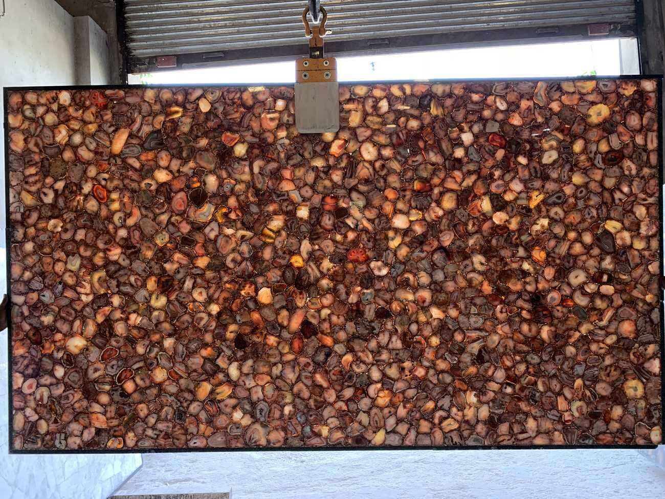 Le lastre di agata rossa sono prodotte incollando insieme numerose lastre più piccole di agata rossa. Il risultato è costituito da grandi lastre di pietra semipreziosa dall'effetto sorprendente, che possono essere retroilluminate grazie alla trasparenza delle gemme. Si tratta di un prodotto molto raro, unico e lussuoso.