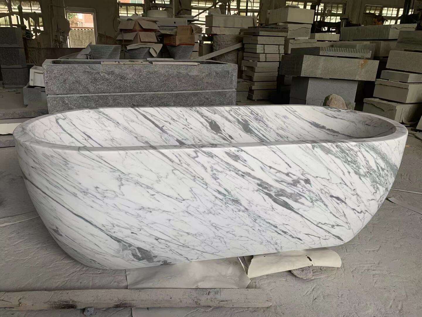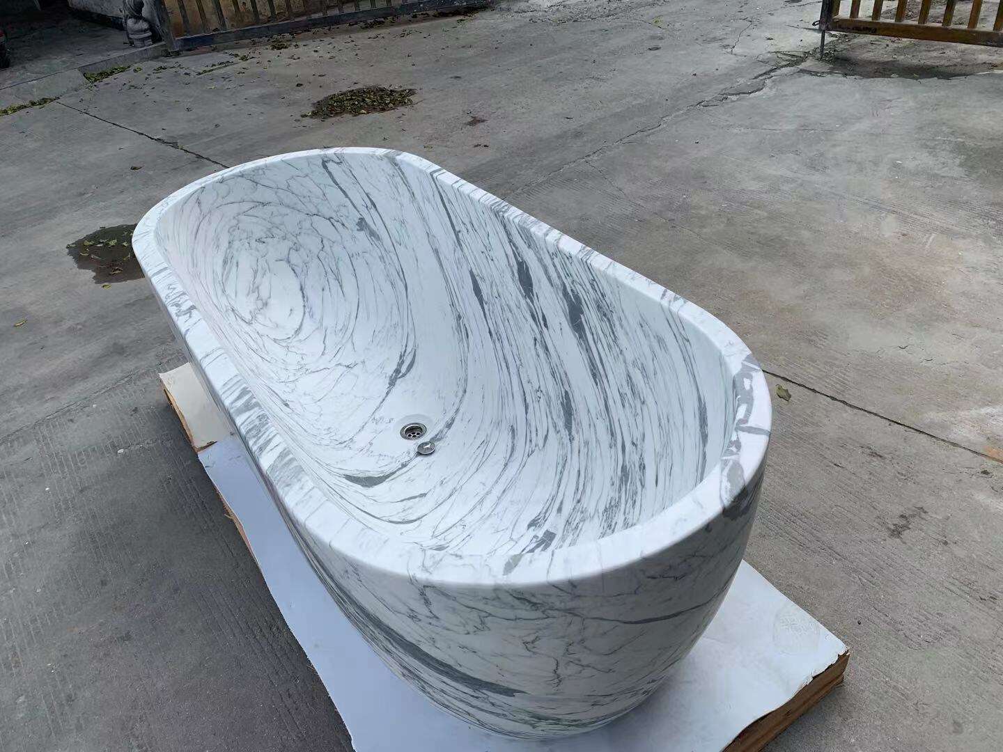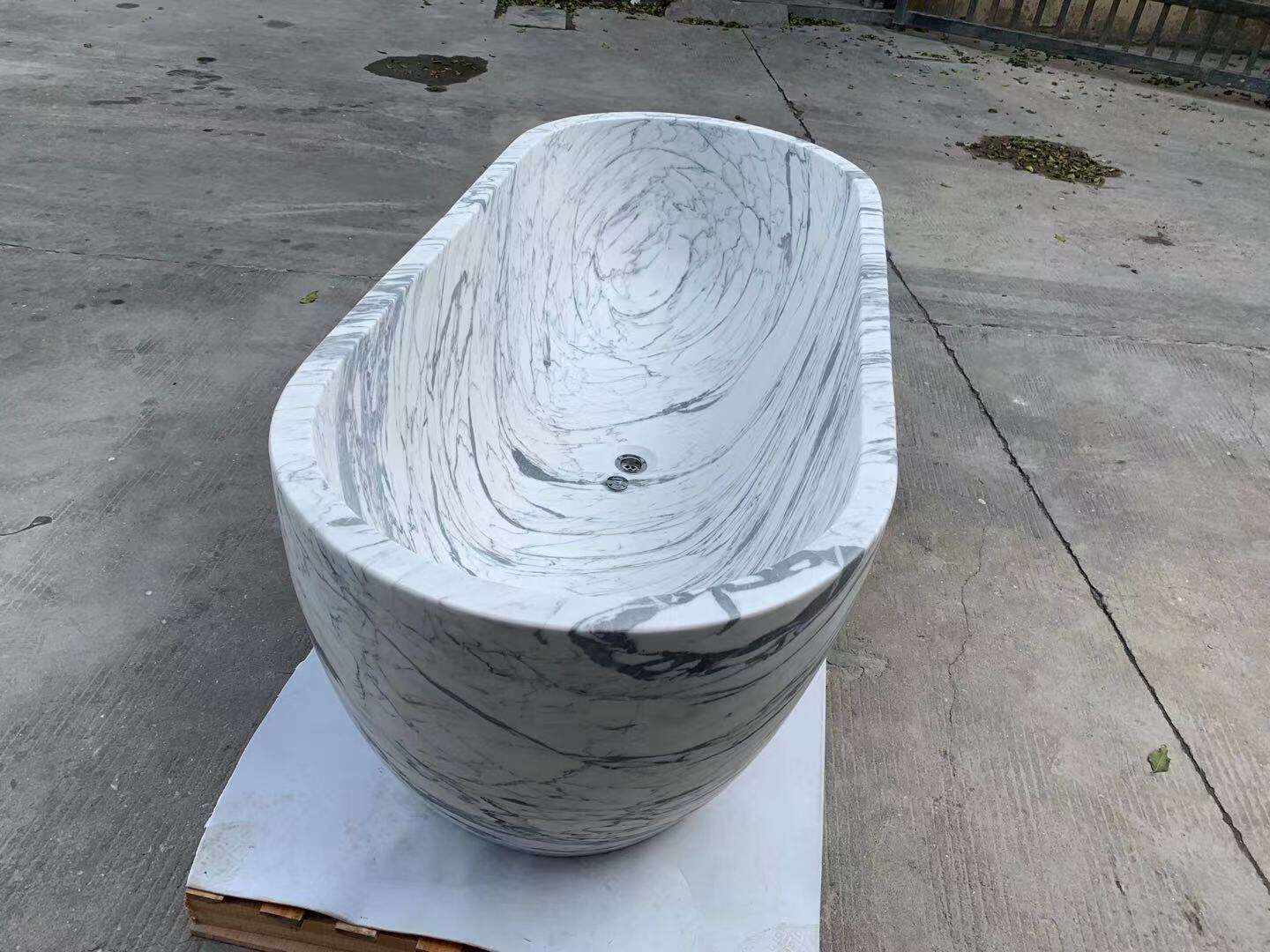 What is marble bathtub? Simple speaking,thewhite marble bathtub which are crafted from the whole piece marble blocks.Thebathtub’s designareuniqueand modern: its exterior and interior feature a striking white base with bold, swirling gray veins that mimic natural marble, giving it a luxurious, high-end aesthetic.
